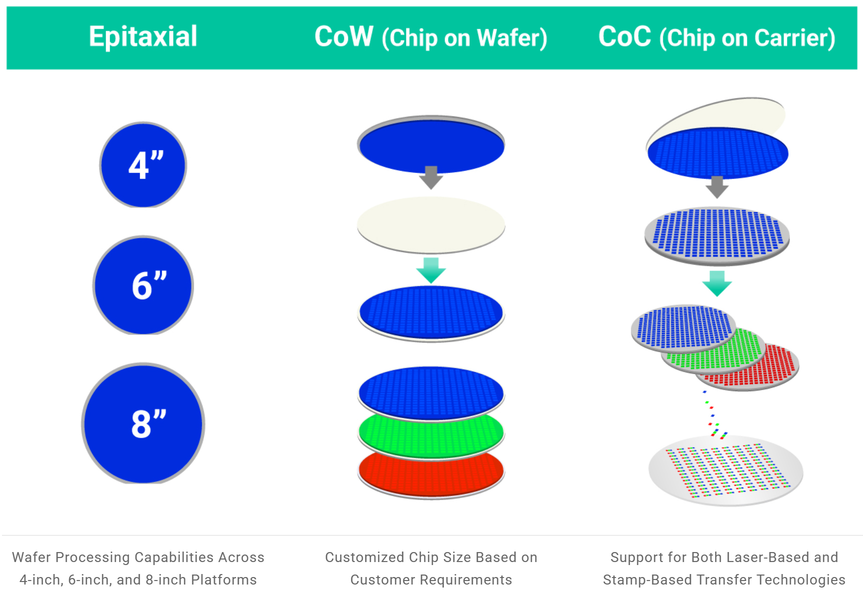 - Provides integrated services spanning Epitaxy (Epi), Chip-on-Wafer (CoW), and Chip-on-Carrier (CoC) processes.