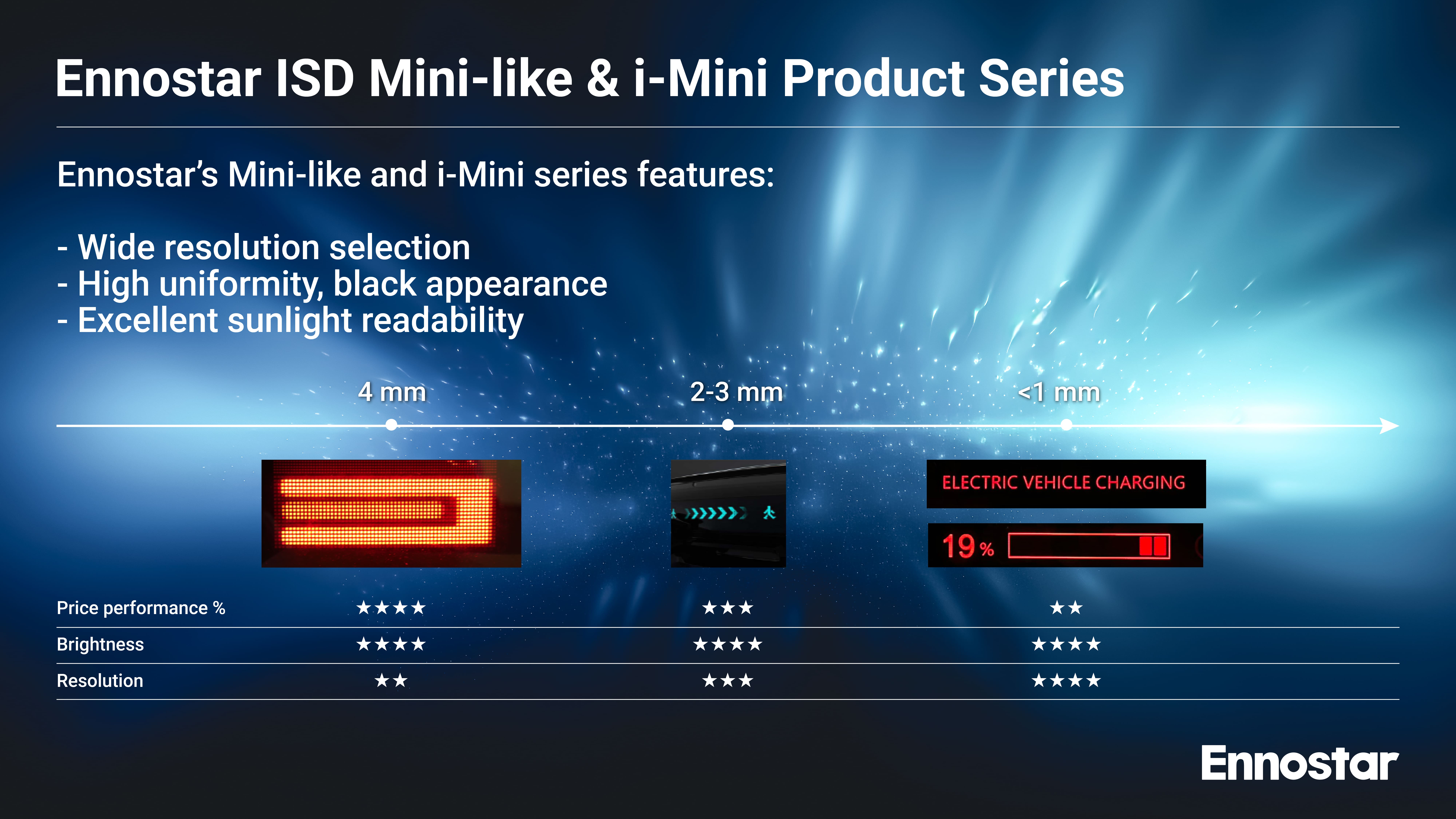 | i-Mini | <1 mm | COB (Chip on Board) | 高解析度與對比度。優異的均勻性、銳利圖形、流暢動畫。 | 品牌logo識別、車外人機溝通介面、車聯網通訊訊息。 |