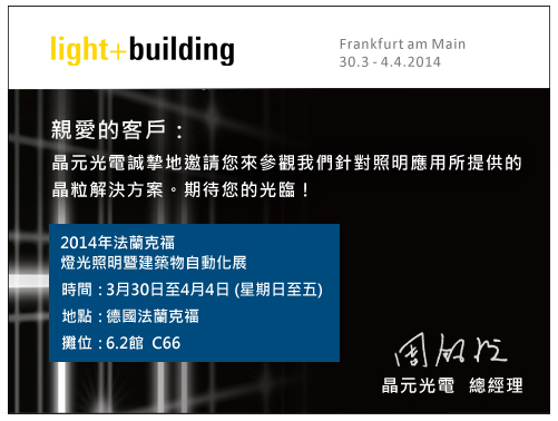 晶元光電邀請您蒞臨2014年法蘭克福燈光照明暨建築物自動化展